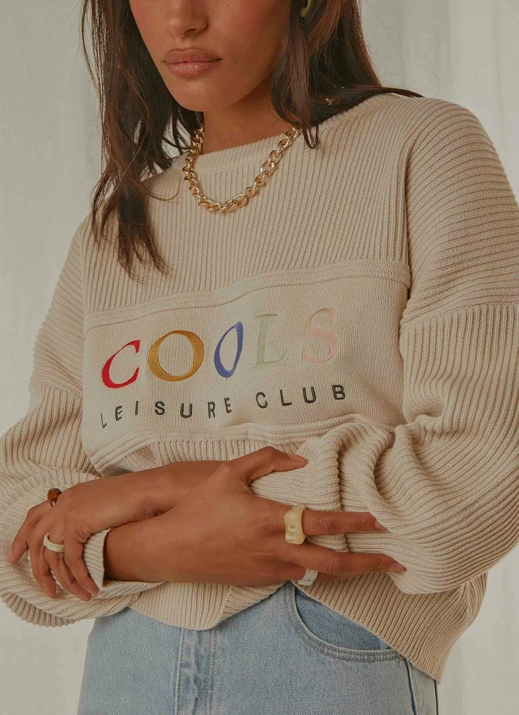 The Cools Leisure Club Knit in Stone. A classic Cools relaxed fit, this sweater features our iconic Leisure logo design with a slightly loose fit so you can layer a T-shirt or cami underneath. Style yours with everything from jeans to mini skirts.