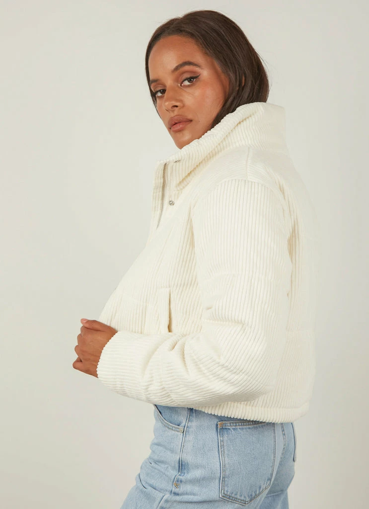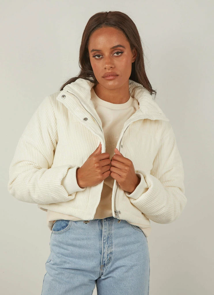 The Puff Club Crop Jacket is cut in a boxy shape from a plush shell and features an exaggerated Cools Club back embroidery, ribbed cuffs, and is quilted and lined with an insulating funnel neck collar.