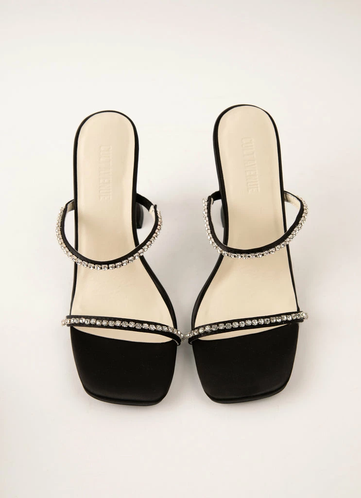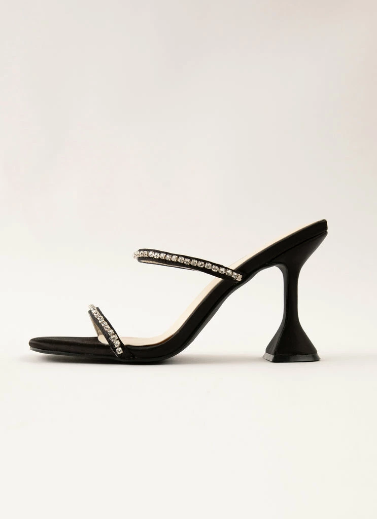 Handpicked for the Peppermayo party girl! Crafted in black satin look finish with diamanté double strap across the foot and finished with an hourglass heel.
