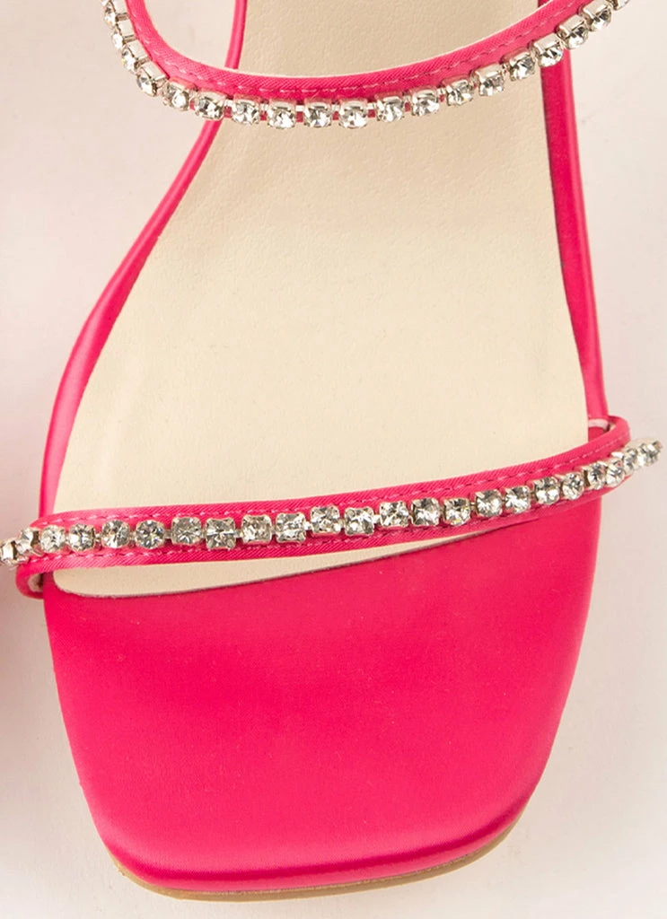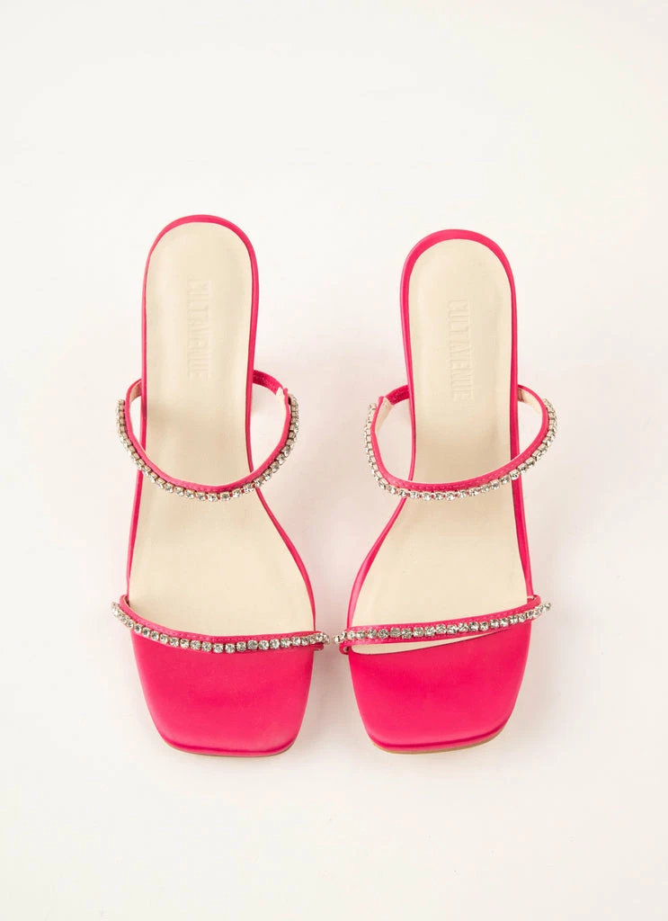 Handpicked for the Peppermayo party girl! Crafted in black satin look finish with diamanté double strap across the foot and finished with an hourglass heel.