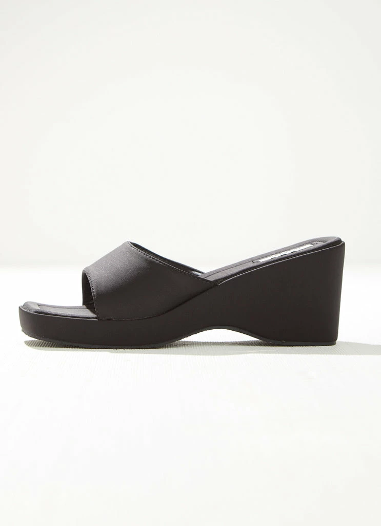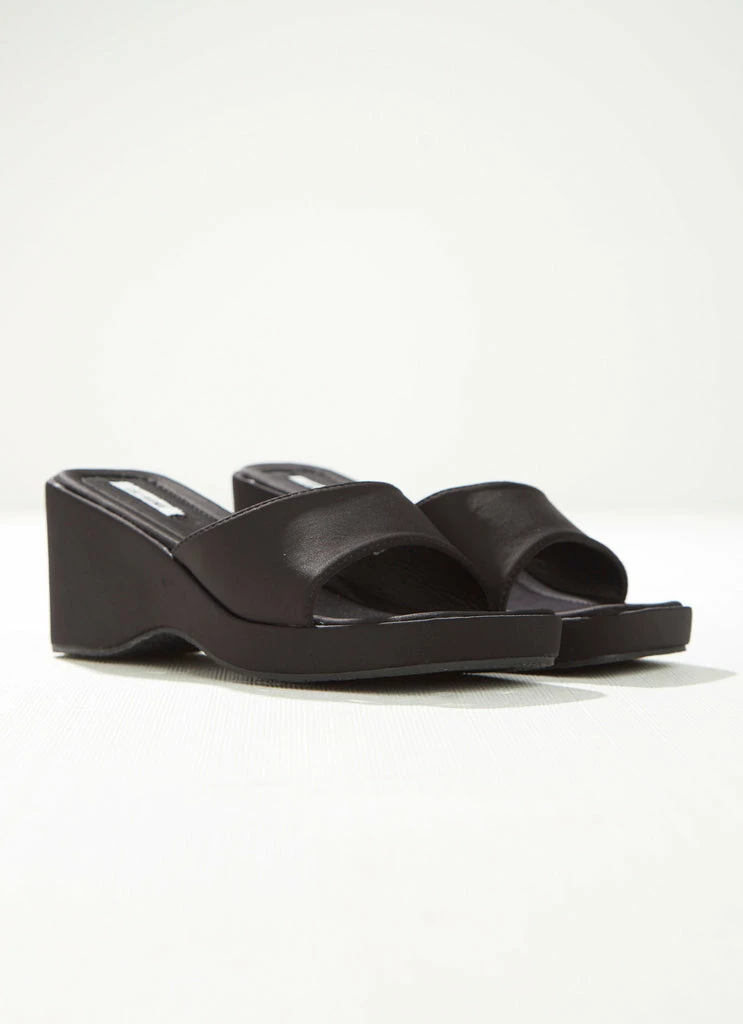 These 90s inspired mules are perfect for adding height to your fave ‘fits. Featuring a black PU strap with a square toe and a platform design, they’re a must-have.