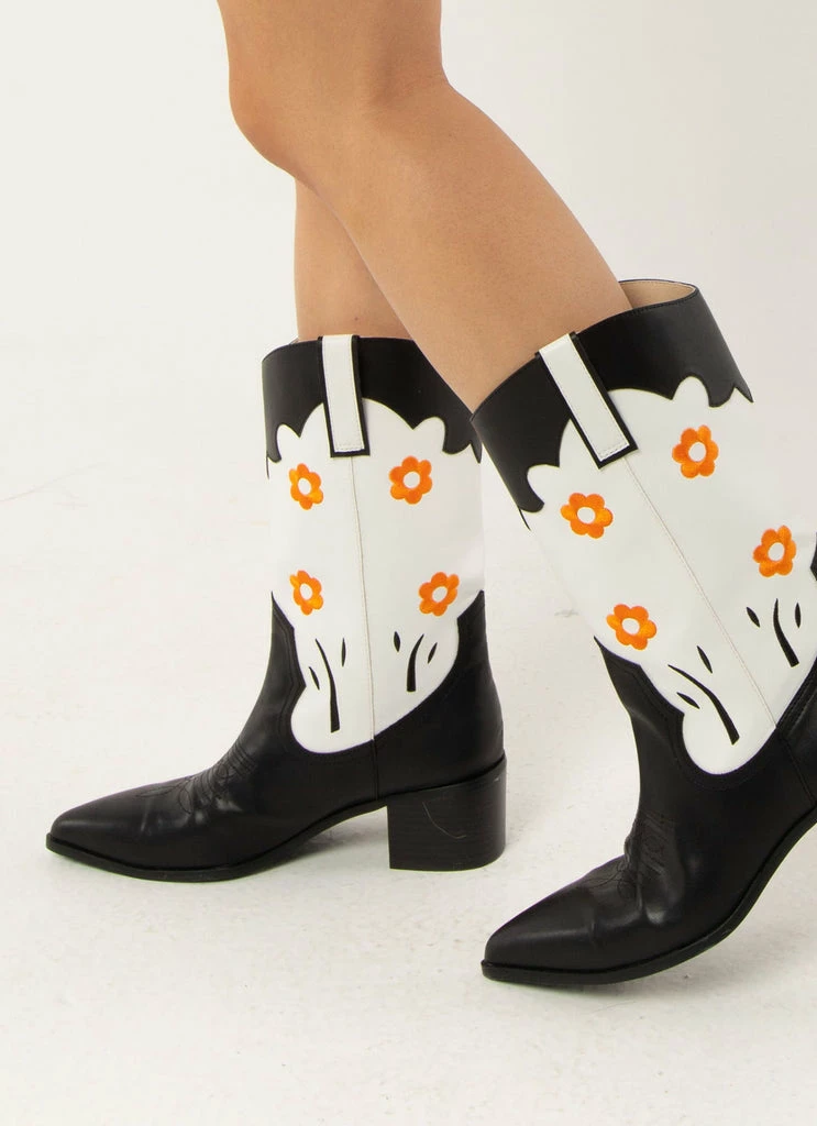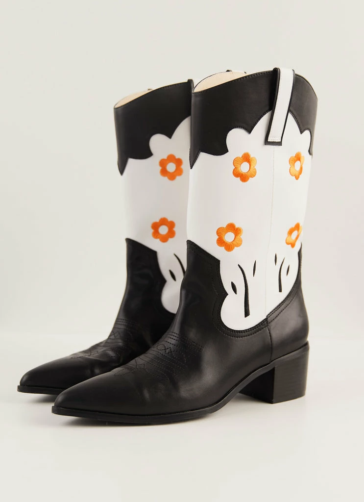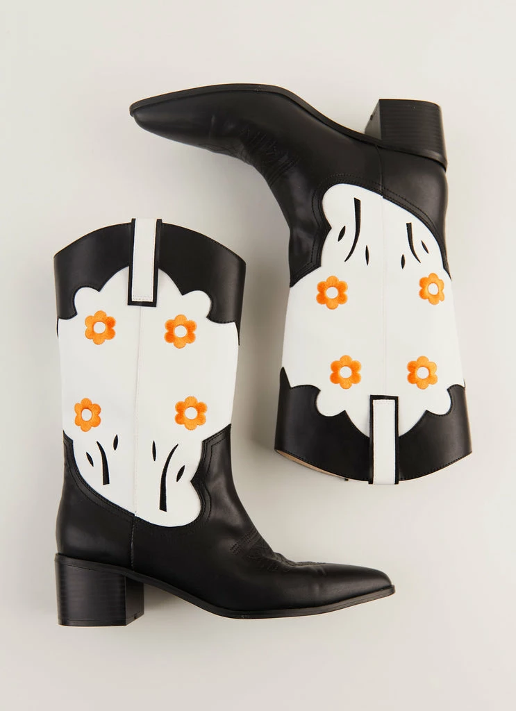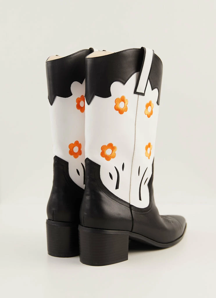 The best thing about bein’ a woman, Is the prerogative to have a little fun! The Shania Cowboy Boots were made for walkin’, featuring contrasting orange embroidered floral motifs and stitch work across through the foot.