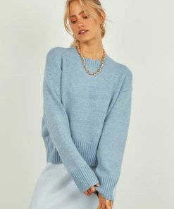 Crafted from a premium fluffy yarn with an extra soft texture, The Ari Knit Jumper in Denim Blue is a relaxed fit with drop shoulders and long sleeves. Features a cozy hand feel that is soft on the skin and rib detail at the neckline, body hem and cuffs.