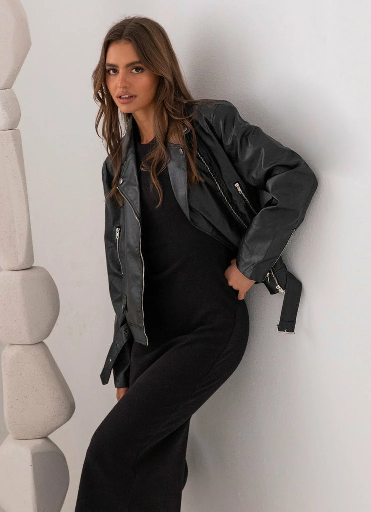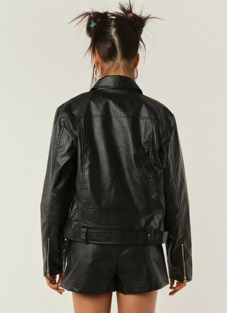 Made for the fashion trailblazers! The Blaze PU Biker Jacket is an oversized moto style biker jacket with contrasting silver hardware and removable belt at the waist. The perfect finish to any look!
