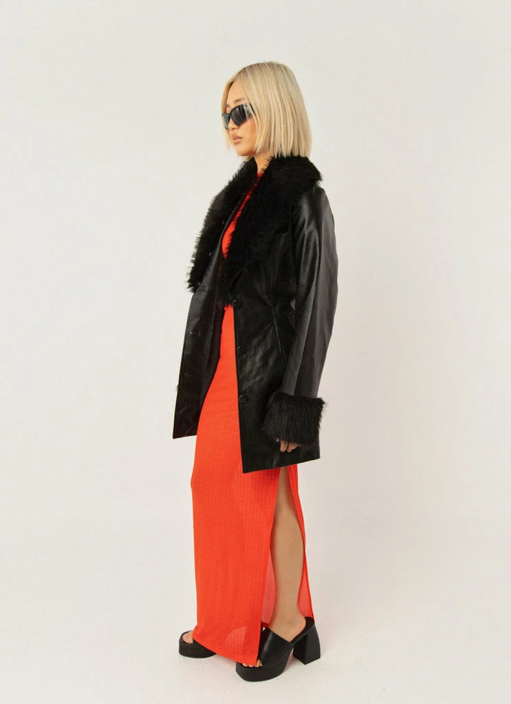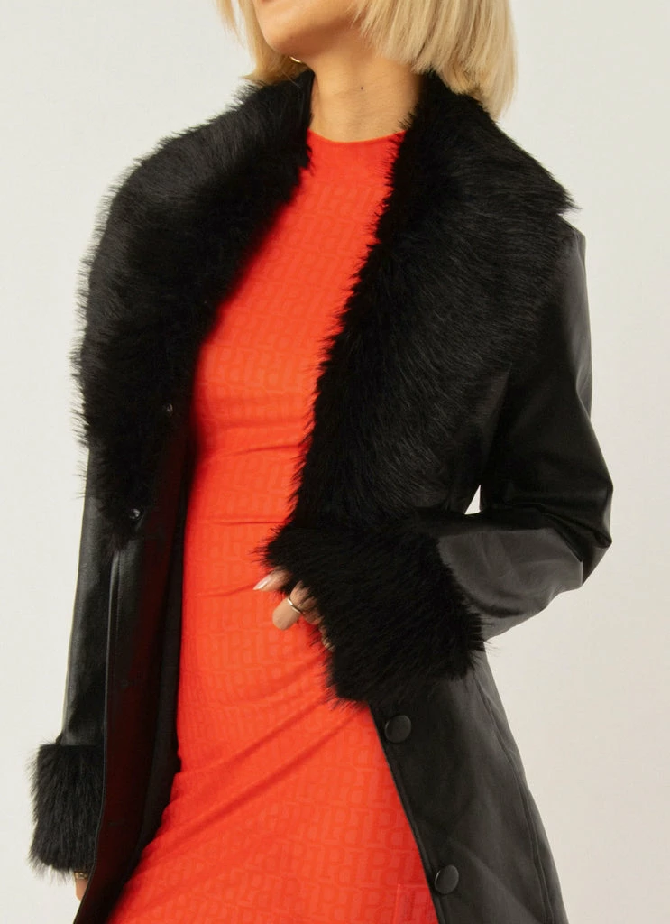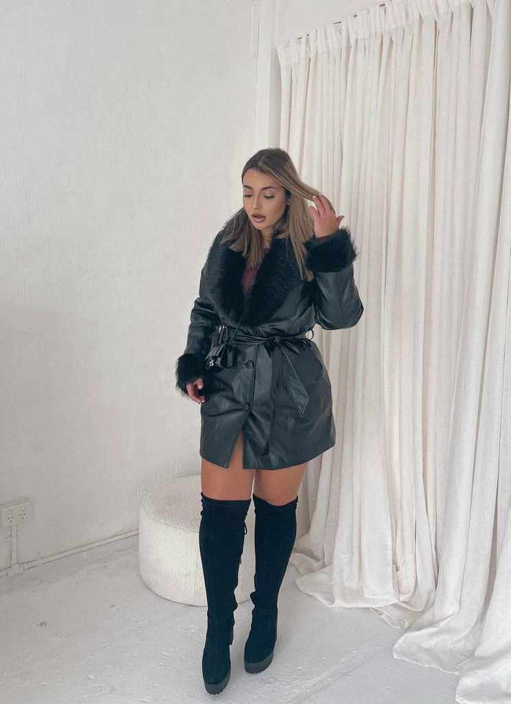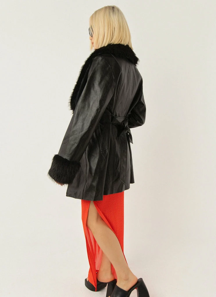 A 90’s vision! The Cassie PU jacket is what all retro dreams are made of with faux fur cuffs and a removable lapel. The perfect length and button down front, easy to cinch at the waist with the removable self tie belt.