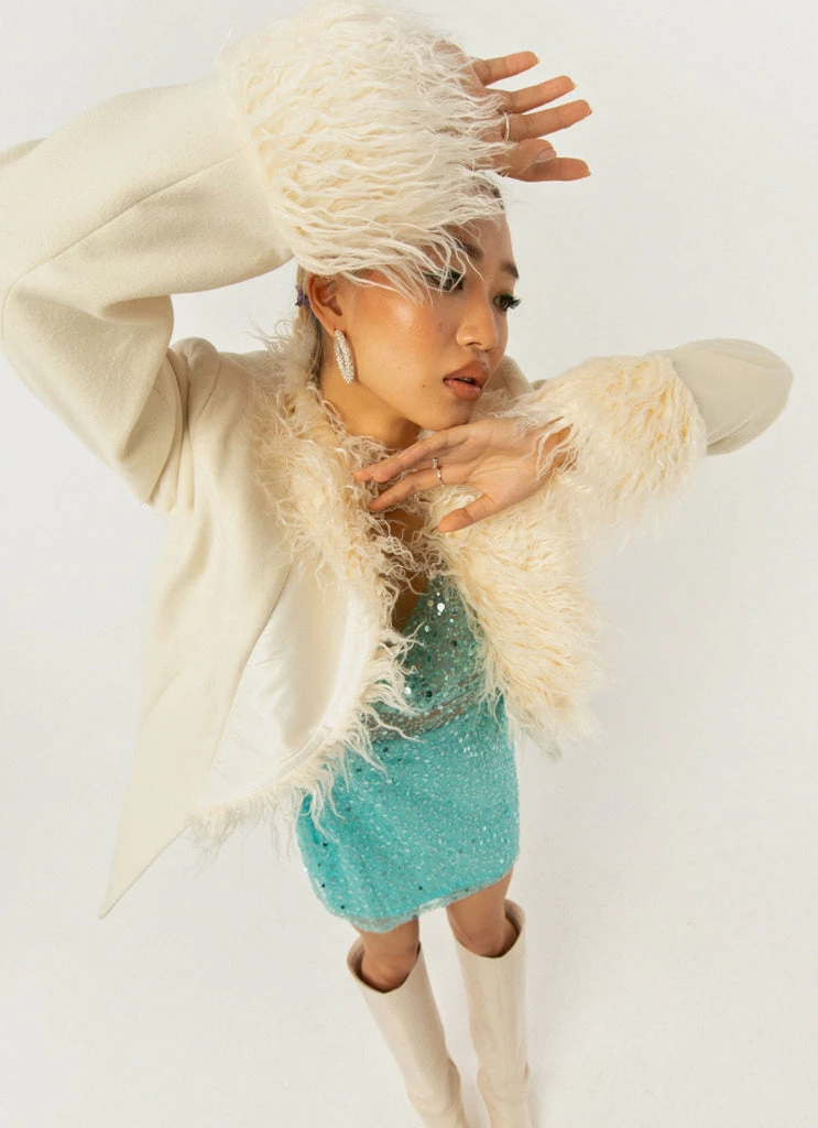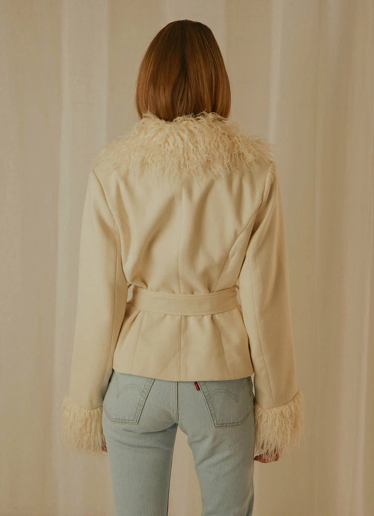 A trip down memory lane with the Maddy Faux Fur Jacket. A 70’s inspired jacket featuring shaggy lapel, collars and cuffs. Single internal button closure with belt and buckle. Complete the retro look with a cropped white tank high waisted vintage denim.