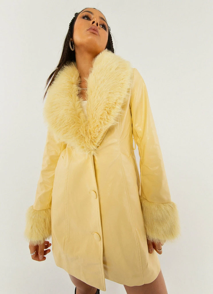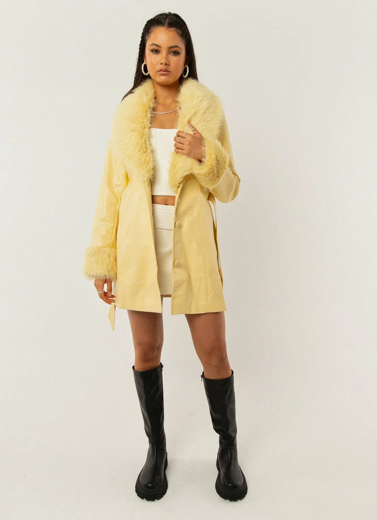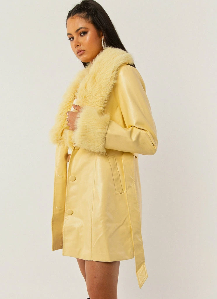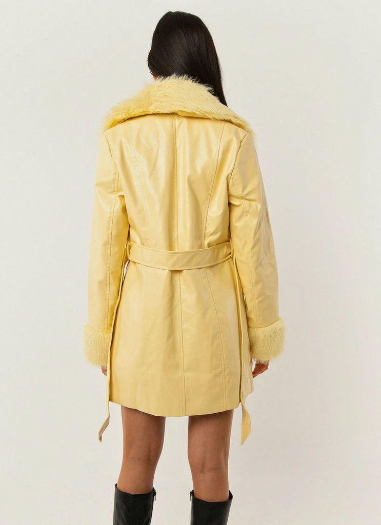 A 90s vision! The Song Of Sunshine PU jacket is what all retro dreams are made of with faux fur cuffs and a removable lapel. The perfect length and button down front, easy to cinch at the waist with the removable self tie belt.
