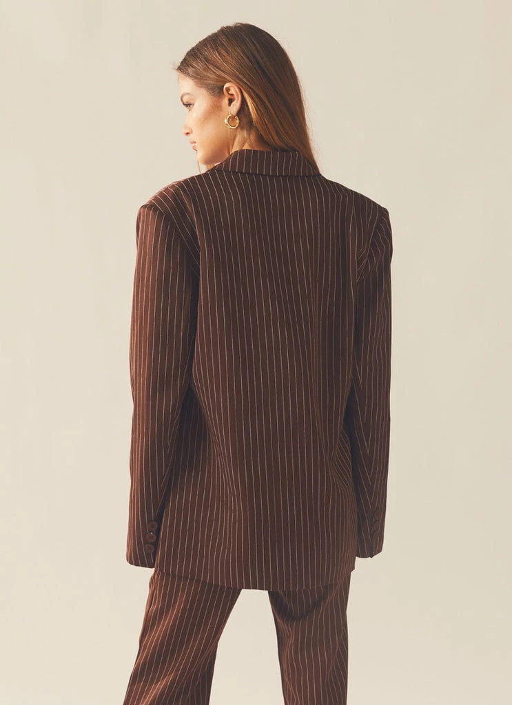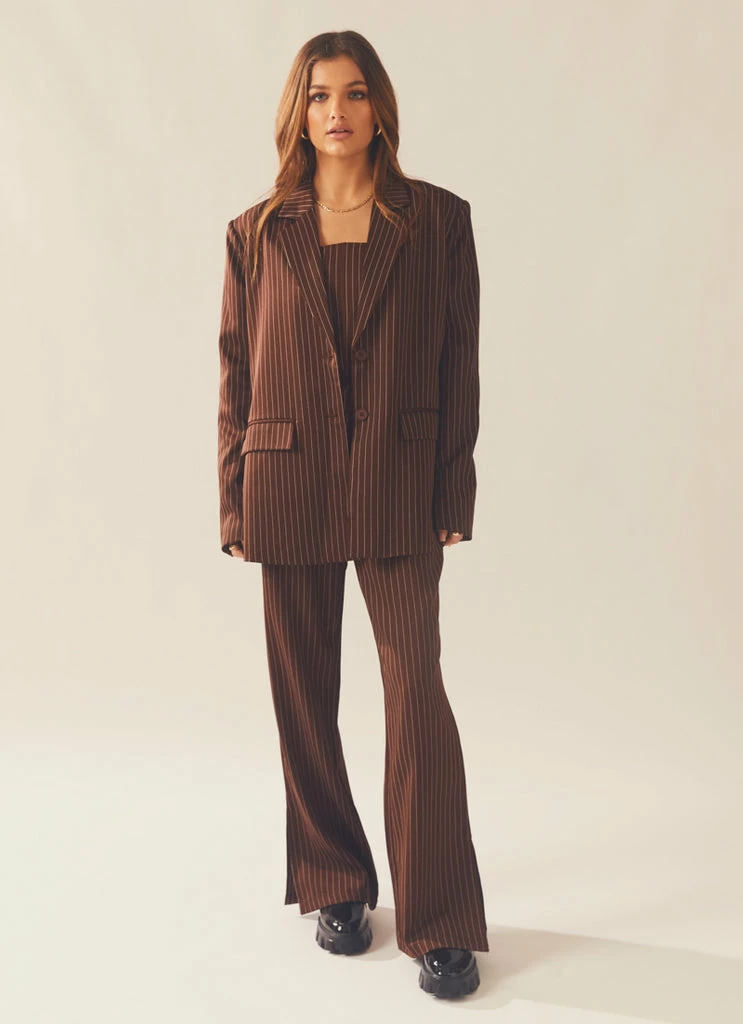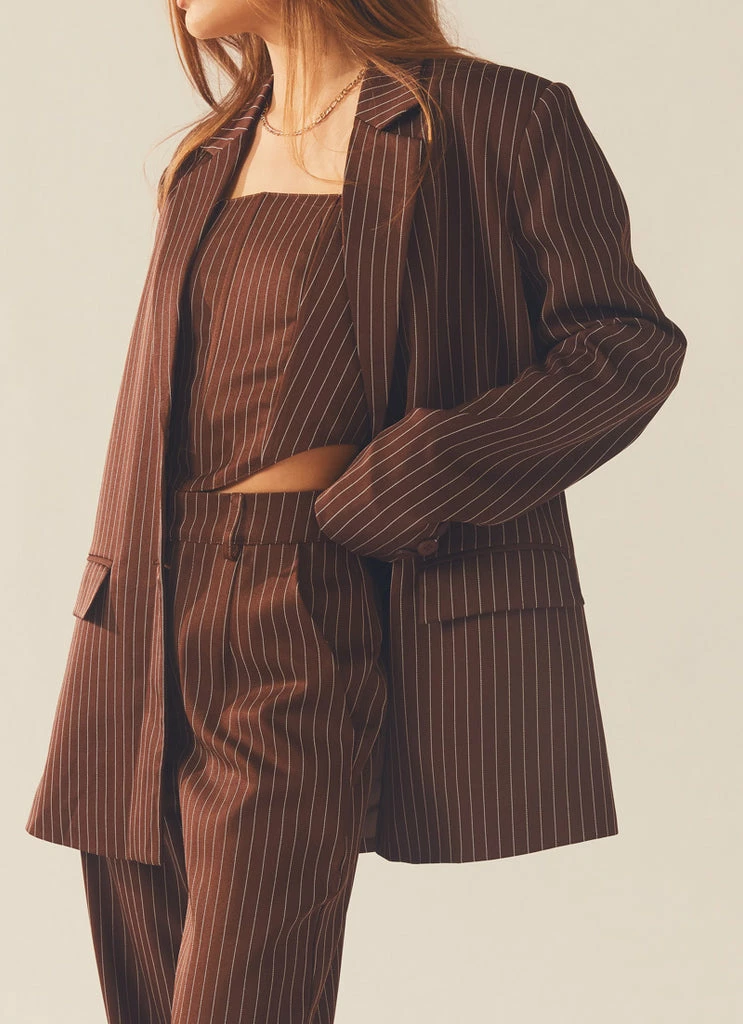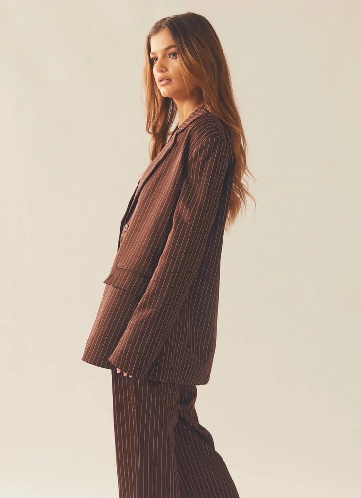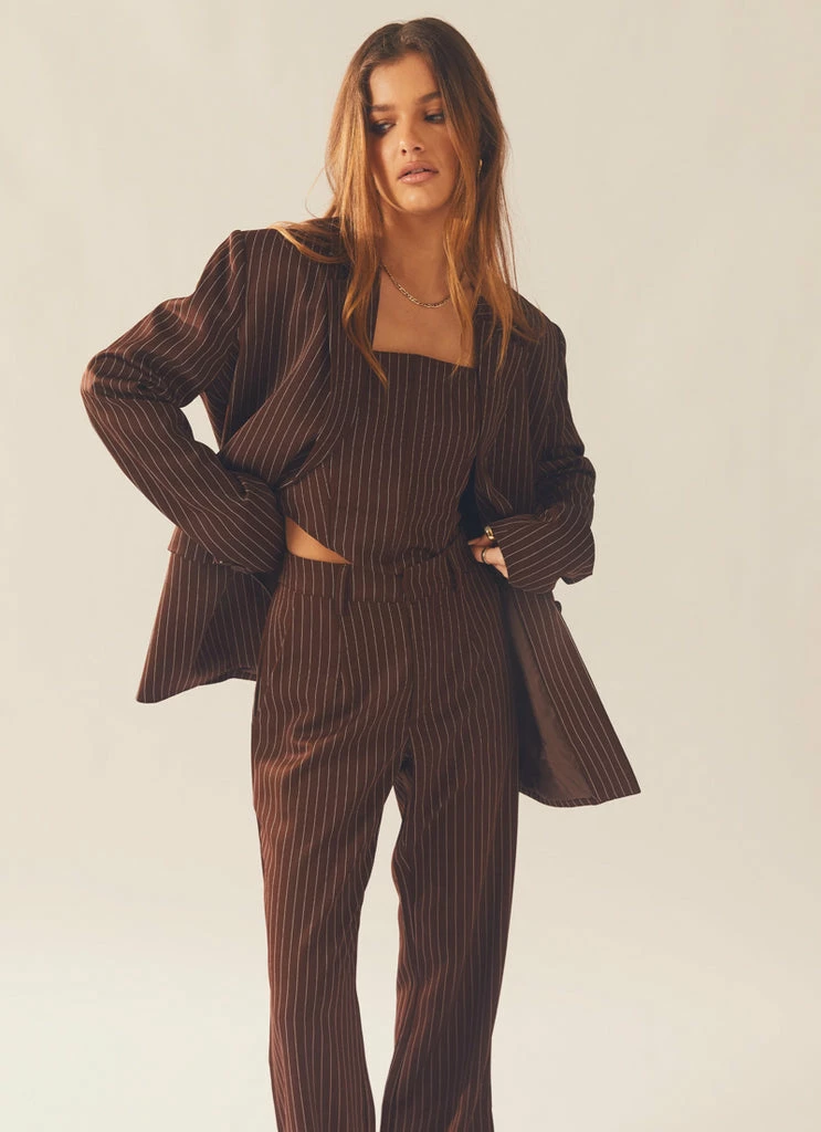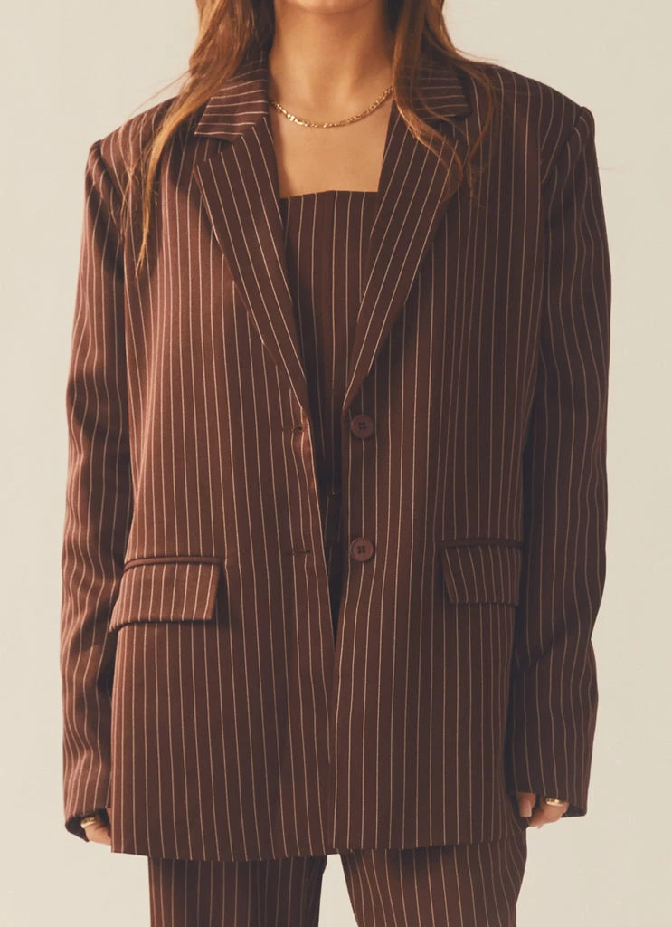 For the sexy and sophisticated Peppermayo girl. The Talula Pinstripe Blazer is a relaxed fit blazer in chocolate brown with pinstripe print and 2 pocket detailing at the front. A suit is always a good idea! Pair is back with the Talula Pinstripe Bustier and Talula Pinstripe Pants for the ultimate power suit look.